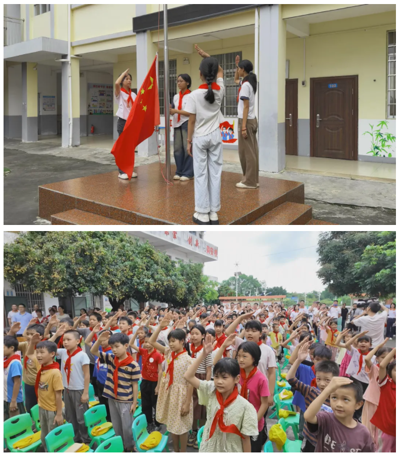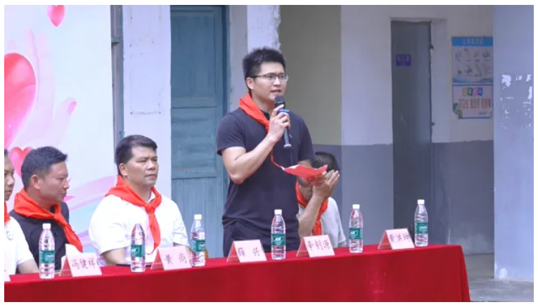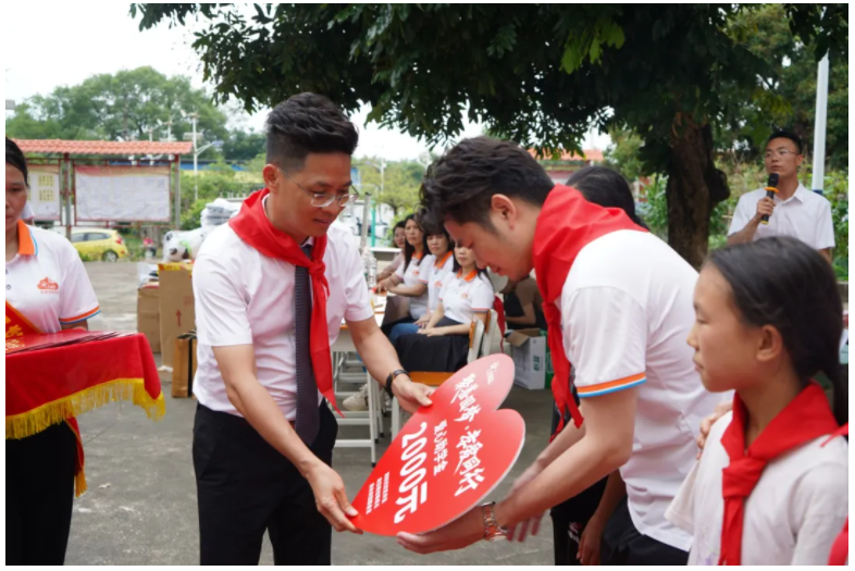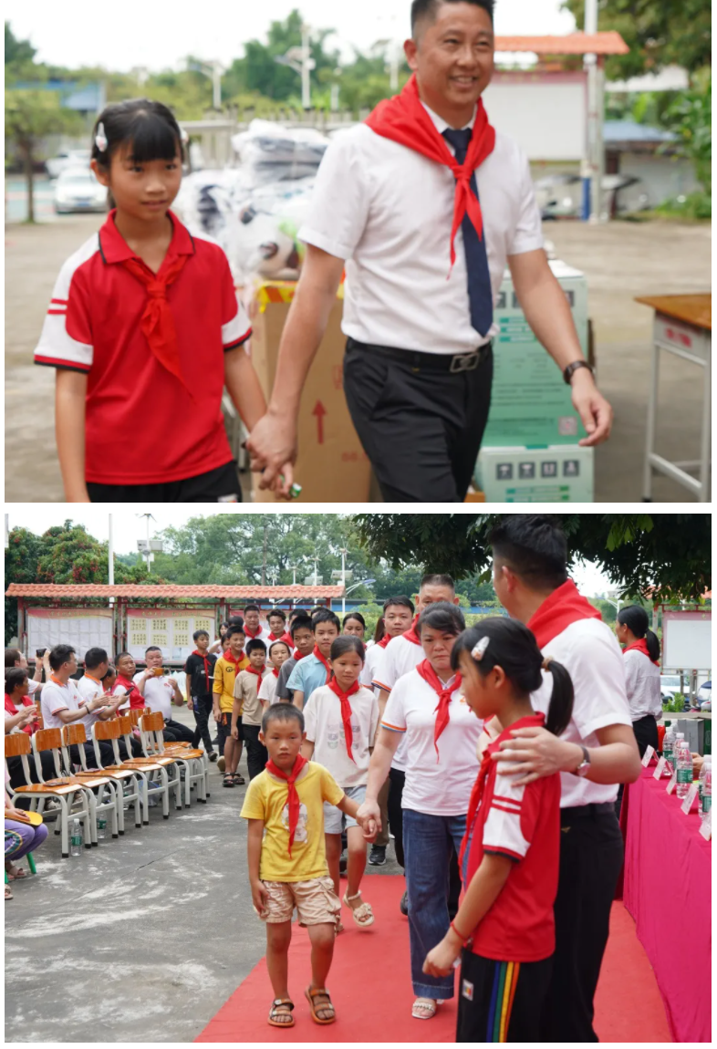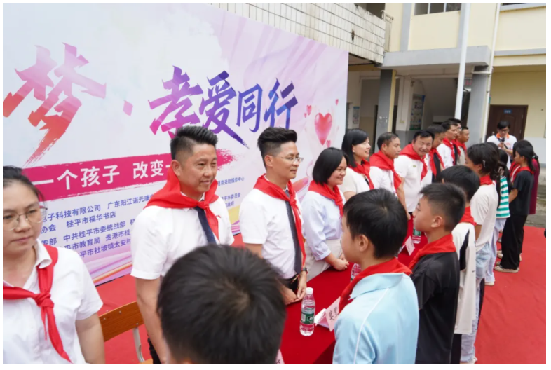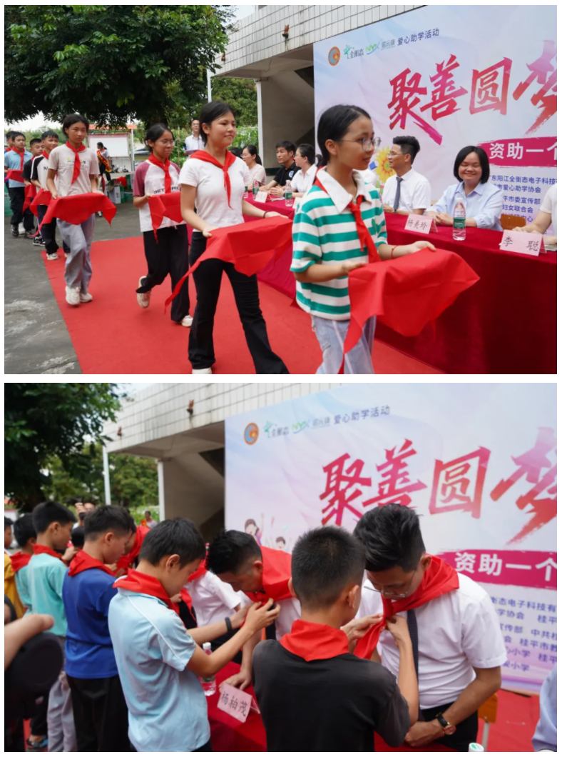 少先队员代表迈着整齐的步伐,为前排就座的领导和嘉宾佩戴上鲜艳的红领巾。这一刻,红领巾不仅是少先队员的荣光,更象征着爱心与责任的传递,连接起社会关爱与乡村学子的未来希望。