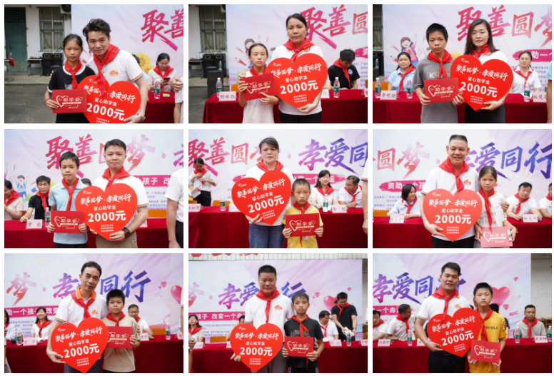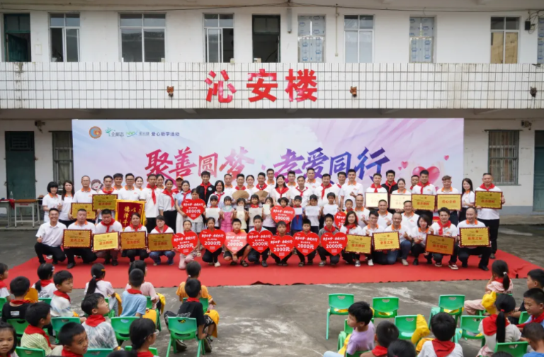 随后,主持人号召全体师生、所有到场爱心人士有序登台,拍摄温暖的全家福。一声 “聚善圆梦,孝爱同行,好好学习,天天向上!”的响亮口号,将全场气氛推向高潮,也寄托了对孩子们最殷切的期望。镜头定格下数十张洋溢着感动、希望与感恩的笑脸,成为本次活动最温暖的集体记忆。